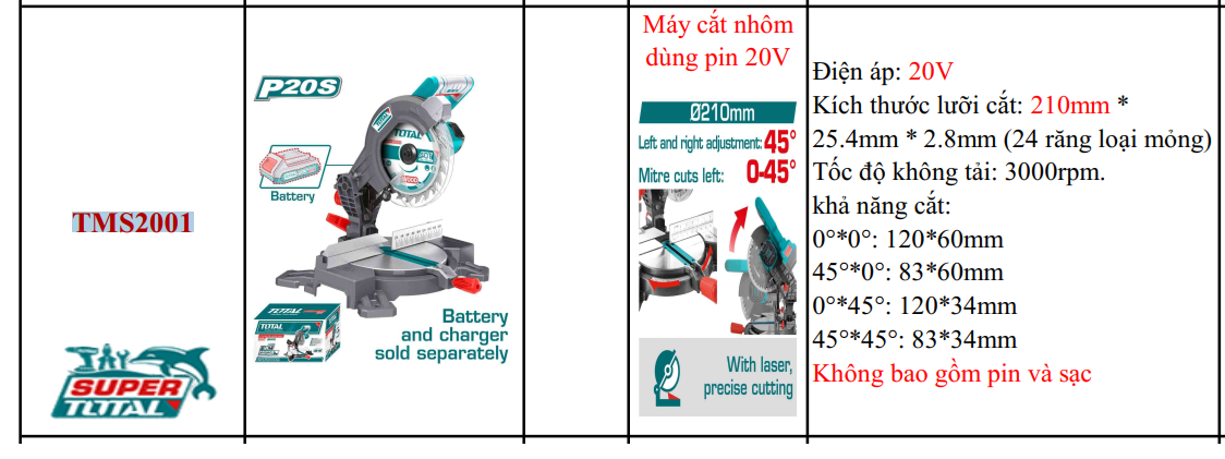 20V Máy cắt nhôm dùng pin 210mm Total TMS2001