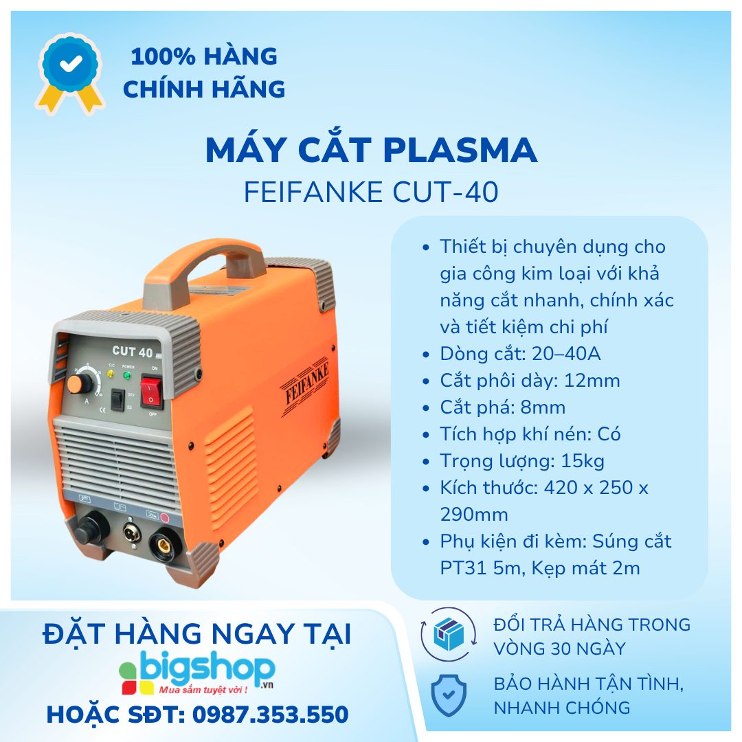 Máy cắt plasma 220V FEIFANKE CUT-40 là thiết bị chuyên dụng cho gia công kim loại với khả năng cắt nhanh, chính xác và tiết kiệm chi phí. Sản phẩm hoạt động với nguồn điện dân dụng 220V, phù hợp cho xưởng cơ khí nhỏ và công trình. Thiết kế nhỏ gọn, dễ di chuyển, tích hợp khí nén giúp nâng cao hiệu suất cắt và độ ổn định trong quá trình sử dụng.