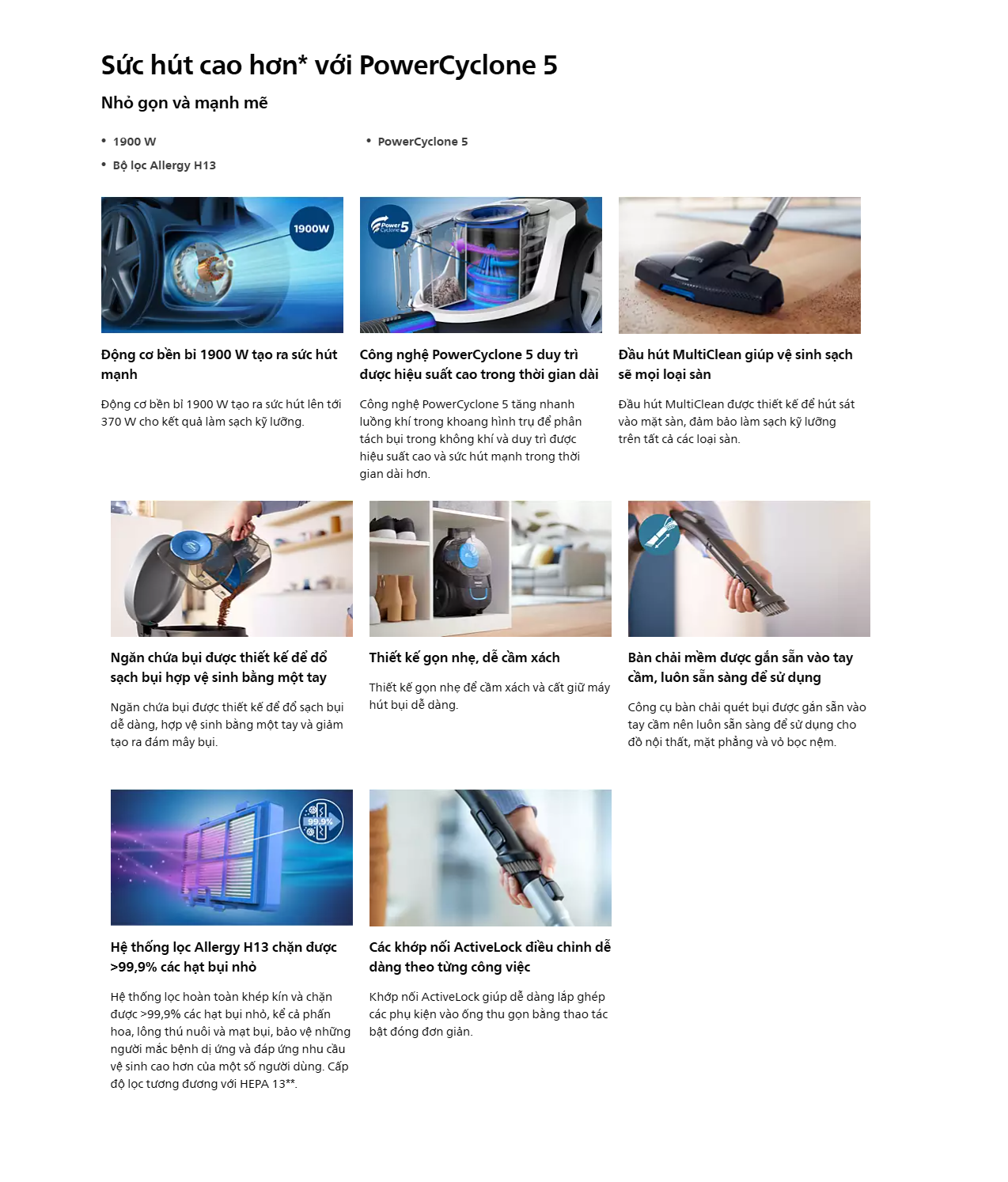 Máy hút bụi gia đình Philips 3000 Series FC9351/01 thiết kế gọn nhẹ – hiệu quả tối ưu, trang bị công nghệ PowerCyclone 5 với động cơ 1900W mang lại lực hút lên đến 370W, dễ dàng làm sạch bụi bẩn trên sàn cứng và thảm.